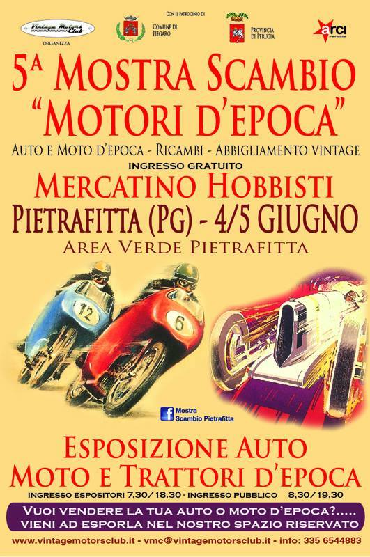La quinta edizione MOSTRA SCAMBIO "MOTORI D'EPOCA" si trasferisce nell'area verde di Pietrafitta il 4/5 Giugno 2016, tra le novità di quest'anno mercatino degli hobbisti, esposizione di trattori d'epoca.
