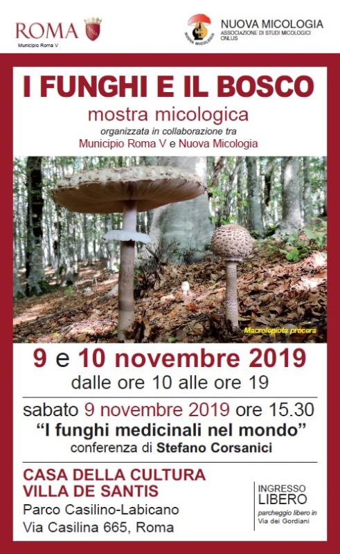 Nei giorni nei giorni 9 e 10 novembre 2019 avrà luogo a Roma la XVIII edizione della mostra “I funghi e il bosco - visite guidate nel mondo dei funghi” che quest’anno si terrà nella “Casa della cultura di Villa de Santis”, Parco Casilino-Labicano, via Casilina, 665.