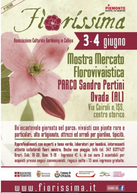 Fiorissima primavera si svolgerà nel parco pubblico Sandro Pertini di Ovada, un parco nel cuore della città, un evento florovivaistico, organizzato dall'associazione culturale Gardening in collina, che è riuscito a diventare un appuntamento atteso dagli amanti dei fiori e dei giardini, per la selezione dei vivai presenti, per la qualità delle piante esposte e per la particolarità degli oggetti ed arredi inerenti al mondo del giardinaggio che vi vengono esposti.Protagoniste sono le piante, rose, piante erbacee, piante acquatiche, aromatiche, orchidee, ortensie, piante grasse.