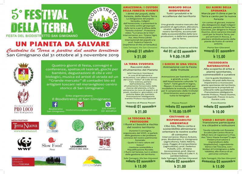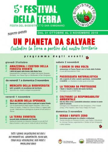 Quattro giorni di festa, convegni e conferenze, proiezioni video e documentari, giochi per bambini, degustazione di cibi e vini biologici, musica ed artisti di strada ed il “Grande mercato” di agricoltori biologici ed artigiani toscani. Non solo, l’attenzione e l’amore per la terra e per l’ambiente si concretizzeranno con una marcia per il clima e per la foresta con la partecipazione d’eccezione di alcuni nativi dell’Amazzonia. Torna dal 31 ottobre al 3 novembre nel centro storico di San Gimignano il “Festival della Terra” giunto alla sua quinta edizione e quest’anno dal titolo “Un pianeta da salvare. Custodire la Terra a partire dal nostro territorio”. La manifestazione è organizzata dal Biodistretto costituito nel 2013 con il contributo del Comune di San Gimignano. «Il Comune di San Gimignano è ben lieto di patrocinare il Festival della Terra – commentano il Sindaco Andrea Marrucci e l’Assessora Carolina Taddei -, perché pone l’accento e la nostra attenzione su temi decisivi di questo secolo per l’intera umanità: dall'emergenza climatica alla decarbonizzazione dell’economia, dalla tutela della biodiversità al ciclo dei rifiuti, dal cibo alla gestione dell’acqua. Tutti temi di cui ci stiamo occupando già in questi primi mesi e che nelle prossime settimane vedranno azioni concrete come, ad esempio, le norme plastic-free, la rivoluzione del sistema di raccolta rifiuti e nuove piantumazioni in occasione della Festa dell’Albero sul territorio comunale».