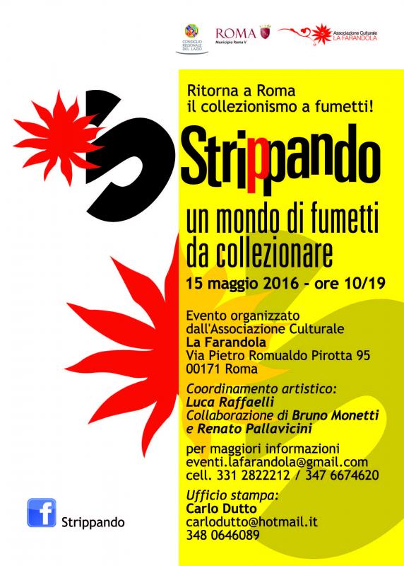 Si tiene a Roma – domenica 15 maggio 2016 – dalle ore 10:00 alle 19:00, presso i locali dell’Associazione Culturale ‘La Farandola’ (via Pietro Romualdo Pirotta, 95), il secondo appuntamento di “Strippando - Un mondo di fumetti da collezionare”, evento che darà l’occasione agli appassionati di fumetto di incontrarsi, trovare pezzi rari, completare le proprie collezioni, conoscere collezionisti, autori ed editori, visionare film, partecipare a dibattiti sul collezionismo e sul mondo del fumetto, ritrovare quindi la gioia di una passione che spesso non ha un luogo dedicato in cui esprimersi. 'Strippando', organizzato dall'Associazione Culturale 'La Farandola', si avvale del coordinamento artistico del giornalista e scrittore Luca Raffaelli, la collaborazione del collezionista Bruno Monetti e del giornalista Renato Pallavicini e si svolgerà tutti i mesi, una domenica al mese.