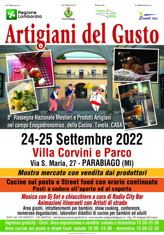 Sabato 24 e Domenica 25 Settembre 2022 torna, come ogni anno, Artigiani del Gusto, Rassegna nazionale Mestieri e Prodotti Artigiani nel campo Enogastronomico, della Cucina, della Tavola, della Casa, dedicata all’enogastronomia ed ai prodotti collegati a cibo, tavola e cucina, nella storica e suggestiva location di Villa Corvini, a Parabiago, vicino a Milano.