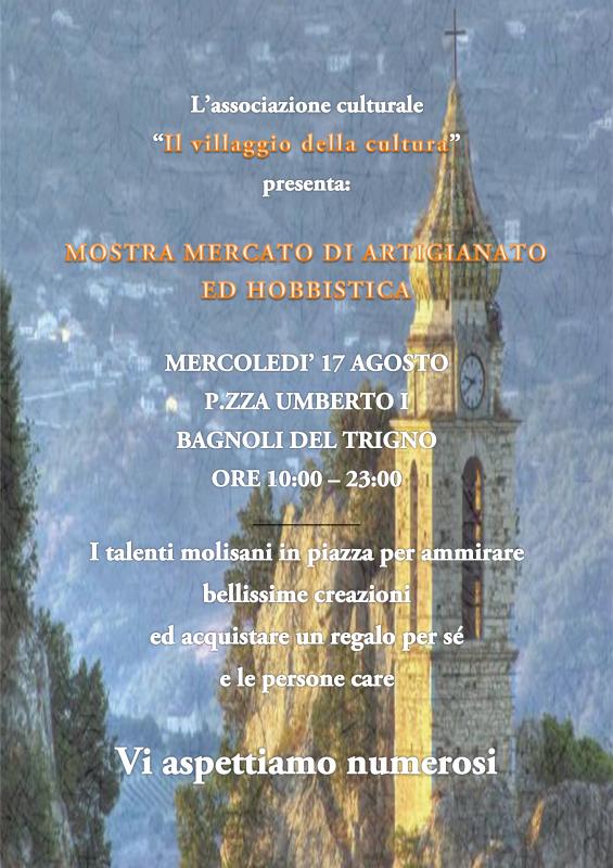 Mercoledì 17 agosto 2016, l'associazione culturale "Il villaggio della cultura", vi invita in Piazza Umberto I a Bagnoli del Trigno (IS) per la mostra mercato di artigianato ed hobbistica giunta alla sua terza tappa nella regione Molise.