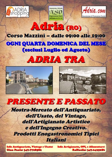L'Associazione Commercianti AdriaShopping, l'Associazione Adria. com, in collaborazione con l'Associazione Culturale NSV Organizzazione Eventi affiliata A.I.C.S. - Comitato Provinciale di Rovigo organizzano per le Domeniche del 28 Maggio, 25 Giugno, 24 Settembre, 22 Ottobre, 26 Novembre, 24 Dicembre 2017, 28 Gennaio, 25 Febbraio, 25 Marzo, 22 Aprile, 27 Maggio 2018, ad Adria (RO), in Piazza Carlo Bocchi dalle ore 09:00 alle ore 19:30 l'appuntamento con la Manifestazione “Adria tra Presente e Passato”, che prevede la Mostra-Mercato dell'Antiquariato, del Modernariato, dell'Usato, del Vintage e degli Oggetti di altri tempi. Ci sarà inoltre la presenza di Espositori delle Tradizioni Popolari, dell'Artigianato Artistico e delle Opere d'Ingegno Creativo con Curiose ed introvabili Idee Regalo per la Casa ed il Tempo Libero; bancarelle di Prodotti Enogastronomici Tipici Regionali d'Italia con Degustazioni e Specialità Alimentari Dolci e Salate Stagionali; Prodotti e Rimedi Naturali per la Cura del Corpo e del Vivere Sano, Punti Ristoro con Operatori dello Street Food, Giochi Gonfiabili, Animazioni per Bambini e Adulti.