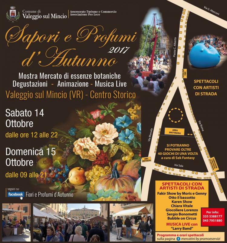 Sabato 14 e domenica 15 ottobre 2017 a Valeggio Sul Mincio, in Piazza Carlo Alberto, Fiori e Profumi d’Autunno, la mostra mercato di arte floreale, artigianato, prodotti naturali, degustazioni e spettacoli musicali a cura Ass.to Turismo, in collaborazione con Federfiori.