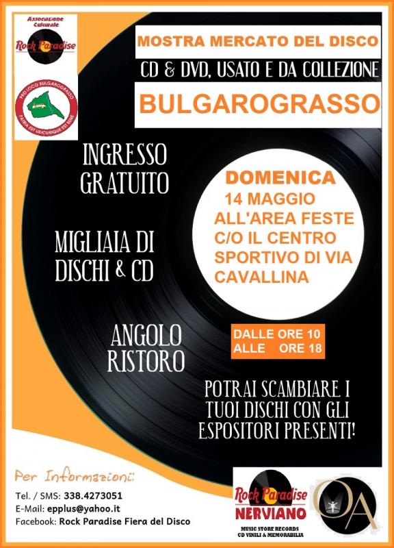 Per la MOSTRA MERCATO DEL DISCO E CD PER HOBBISTI, Domenica 12 MAGGIO dalle ore 10:00 alle ore 18:00 ci troverete a BULGAROGRASSO (CO) all’AREA FESTE - C/O IL CENTRO SPORTIVO situato in VIA CAVALLINA.