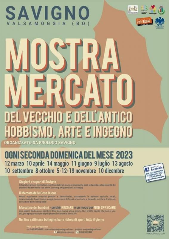 Da Marzo 2023 riprendono gli appuntamenti a Savigno di Valsamoggia, ogni seconda domenica del mese, con la Mostra Mercato del Vecchio e dell'Antico, Riuso, Arte e Ingegno unitamente al Mercato delle Cose Buone.