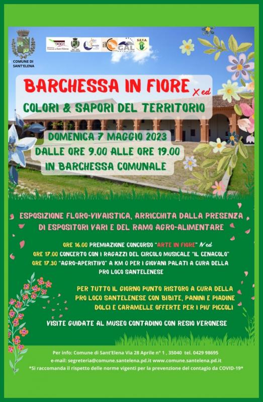 Nella suggestiva cornice della Barchessa comunale di Sant'Elena, Domenica 07 Maggio 2023 dalle ore 09.00 alle ore 19.00 si svolgerà la 10a Edizione della manifestazione floro-vivaistica "Barchessa in Fiore".