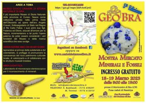 Torna sotto la Zizzola, dopo il successo delle prime quattro edizioni, “GeoBra”, la mostra mercato di minerali, fossili e reperti naturali in programma sabato 18 e domenica 19 marzo 2023 negli spazi del Movicentro, in piazza Caduti di Nassiriya (a fianco della stazione ferroviaria).