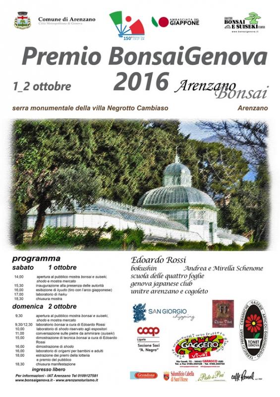 Sabato 1 e domenica 2 ottobre 2016, la serra del Parco Negrotto Cambiaso ad Arenzano ospita la Mostra di Bonsai e Suiseki organizzata dal Comune di Arenzano e dall'Associazione Amatori Bonsai e Suiseki Genova con la collaborazione di Bokushin, Drynemetum, Andrea e Mirella Schenone, Scuola delle Quattro Foglie, Genova Japanese Club, Unitre Arenzano e Cogoleto. L’evento ha ricevuto il Patrocinio delL’Ambasciata del Giappone, in occasione del 150mo delle relazioni diplomatiche Italia GiapponIl Comune di Arenzano promuove le iniziative legate alla cultura del Giappone al fine di onorare la memoria del proprio concittadino Edoardo Chiossone (Arenzano 1833-Tōkyō 1898), incisore e collezionista d’arte giapponese.