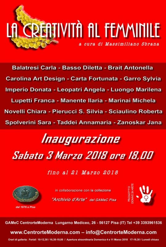 Si inaugura Sabato 3 Marzo 2018 ore 18,00 presso gli storici spazi espositivi del CentroArteModerna di Pisa (Lungarno Mediceo,26) la mostra "La Creatività al Femminile" a cura di Massimiliano Sbrana (fino al 21 Marzo con ingresso libero).