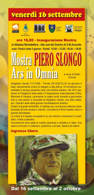 Ars in omnia, come indica il curatore, riprende una citazione di uno scritto molto articolato, Introductoria ars demonstrativae, del teologo e filosofo Raimondo Lullo. Parafrasando e semplificando il concetto insito, l’arte avrebbe lo scopo di evidenziare l’eventuali combinazioni disponibili per fornire una vista completa della realtà. Un significato enciclopedico che Piero Slongo rende pratico, operando nel mondo artistico con energia e sincerità dialettica. Proprio quest’ultima rappresentò un elemento caratteriale che gli permise di elaborare iter pittorici moderni sempre apprezzati in vita.