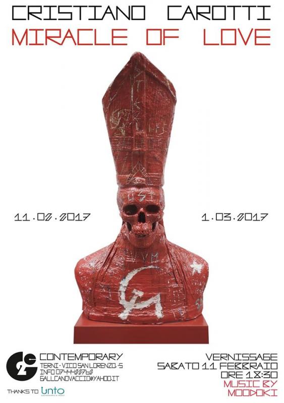 Terza mostra personale di Cristiano Carotti in galleria dopo Decompression Chamber nel 2008 e Nothing but Rainbows nel 2013. Miracle of Love si pone come special project della serie Waterloove, dedicato dall'artista alla propria città e focalizzato sull'icona che rende famosa Terni in tutto il mondo, San Valentino. Carotti presenta una serie di 6 opere su carta gessata ed una scultura che hanno l'intento di reinterpretare secondo la visione e i linguaggi dell'artista l'iconografia del Santo patrono della Città e protettore degli innamorati.