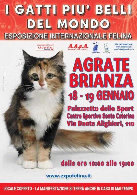 Ad AGRATE BRIANZA un grande evento: I GATTI PIU' BELLI DEL MONDO con la partecipazione di oltre 100 gatti presso il Centro Sportivo Santa Caterina in Via Dante Alighieri nei giorni di sabato 18 e domenica 19 Gennaio, orario dalle ore 10 alle ore 19, si svolgerà l'Esposizione Internazionale Felina con tanti gatti razza che, sotto l'egida dell'Associazione Felina Federata Italiana, verranno giudicati da Giudici Internazionali WCF (World Cats Federation) nel Best in Show in programma al pomeriggio di entrambe le giornate.
