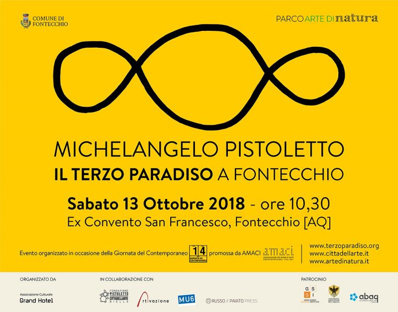 L’inaugurazione è programmata per sabato 13 ottobre 2018 nell’ambito delle manifestazioni organizzate per la Quattordicesima Giornata del Contemporaneo da AMACI e sarà allocato in modo permanente nel mezzo del parco dell’Ex Convento di San Francesco, proprio nel centro del paese, in un punto strategico di eccellente visibilità e sarà accessibile in qualsiasi orario e giorno dell’anno.“Il Terzo Paradiso” a Fontecchio , promosso dal Comune di Fontecchio e curato da Marcella Russo, è organizzato dall’associazione culturale GrandHotel in collaborazione con Cittàdellarte Fondazione Pistoletto, Artivazione e Rivista MU6. L’operazione rientra nell’ambito del progetto culturale PARCO ARTE DI NATURA che prevede la produzione di opere d’arte firmate da artisti internazionali realizzate con materiali esistenti in natura. “Il Terzo Paradiso” è fortemente voluto dal Comune di Fontecchio, nella persona del Sindaco Sabrina Ciancone che, con una visione attenta ai temi della cultura, ha visto nell’opera di Pistoletto l’opportunità di un rilancio per la comunità stessa del borgo.