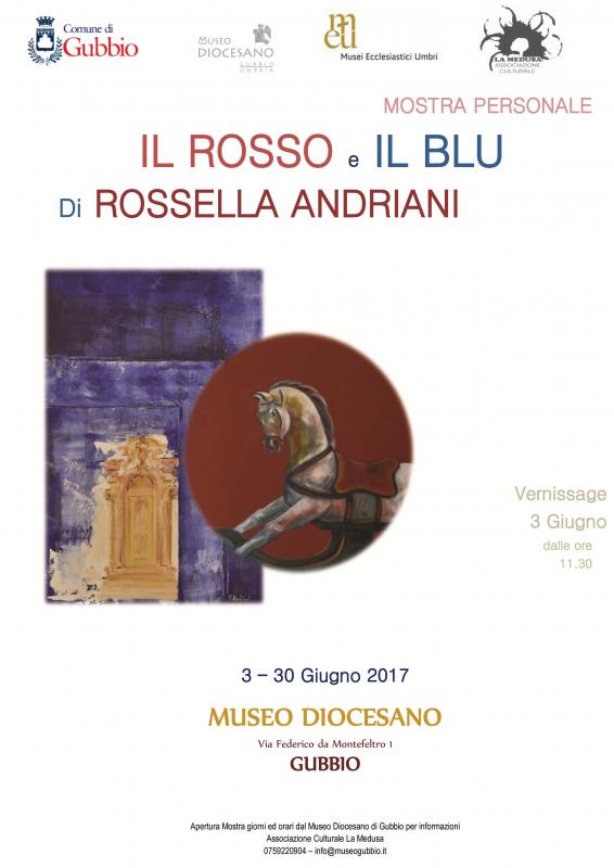 Il Polo Museale Diocesano e l’Associazione Culturale La Medusa promuovono per il mese di giugno 2017, la mostra di Rossella Andriani dal titolo “Il Rosso e il Blu”, patrocinata dal Comune di Gubbio e dall’Associazione MEU-Musei Ecclesiastici Umbri che sarà inaugurata il sabato 3 giugno alle ore 11,30, presso la prestigiosa sede del Museo Diocesano.