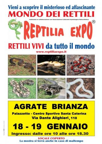 Reptilia Expo - l'affascinante mondo dei rettili presso il Palazzetto dello Sport del Centro Sportivo Santa Caterina di AGRATE BRIANZA (Via Dante Alighieri, n.civ.110) nelle giornate di sabato 18 e domenica 19 Gennaio proporrà una interessante Mostra dove, con orario dalle ore 10 alle ore 19, si potranno ammirare, contenuti all'interno di tanti terrari, moltissimi serpenti tra i più belli ed affascinanti provenienti da tutti i continenti.Una occasione davvero unica per osservare da vicino numerosi esemplari di serpenti e rettili provenienti da ogni parte del globo.Pitoni africani, indiani ed australiani, un magnifico esemplare di pitone indiano albino del peso di 160 chilogrammi, il potente boa costrittore, una temibile anaconda, colubridi americani ed asiatici, il falso corallo, i serpenti velenosi opistoglifi, l'irascibile ed aggressivo pitone del Borneo, il verde serpente degli alberi, ma anche serpenti rari a vedersi dal vivo come il regale serpente pachistano del diadema, il falso cobra sudamericano Hydrodinastes gigas, i serpenti cacciatori di pipistrelli, il serpente del bambù e tanti altri tra cui il serpente americano mangiatore di serpenti.E poi, si potranno ammirare anche tanti altri rettili come i gechi africani tra cui il grande geco To-kai, il drago barbuto, la lucertola gigante africana, un teide (il varano sudamericano), la temibile rana brasiliana Ceratophrine, una giovane testuggine africana e tanti altri ... tutti naturalmente Vivi!Reptilia Expo è la più grande e qualificata Mostra di rettili in Italia che viene presentata ai soli fini culturali; gli animali sono tenuti magnificamente e con assistenza continua; inoltre tante schede illustrano le caratteristiche di ogni animale.