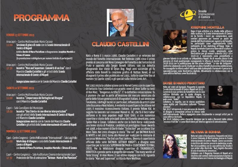 Il via alla kermesse si terrà ad Anacapri nel centro Cacace, venerdì 13 settembre alle 11.00 con una sessione di giochi di ruolo guidata dalla scuola internazionale di Comics di Napoli. L'incontro sarà seguito da giovani allievi e docenti della scuola internazionale di Comis di Napoli tra cui Davide di Marco Pisciottano, Josephine Montella e Silvana di Somma. A seguire in serata, nella stessa giornata è previsto un incontro col maestro Castellini e l'inaugurazione di una mostra con sui disegni.