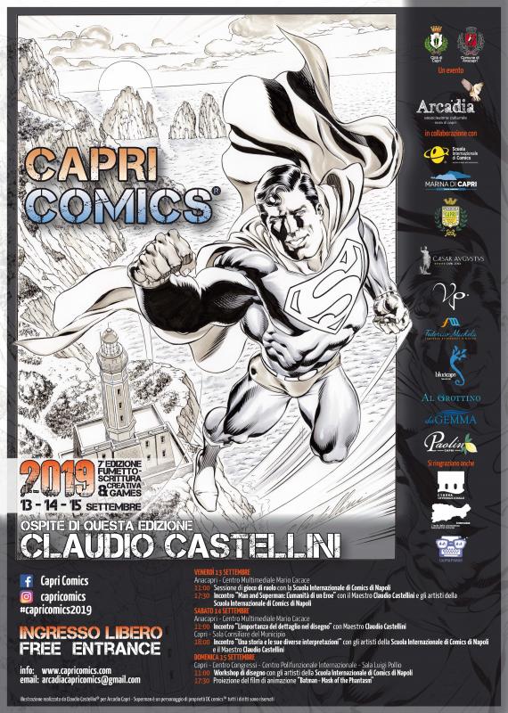Capri Comics 2019, settima edizione del festival del fumetto a Capri. Una tre giorni da venerdì 13 a domenica 15 settembre con incontri su disegno, scrittura creativa e mondo dei games che animeranno l’isola azzurra, tra i due comuni di Capri ed Anacapri, ospite d’eccezione il maestro Claudio Castellini, autore dell’illustrazione di copertina di questa edizione.