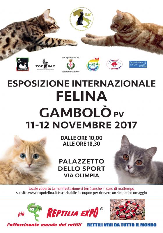 A Gambolò (PV), presso il Palazzetto dello Sport di Via Olimpia, sabato 11 e domenica 12 novembre 2017, dalle ore 10 alle ore 18.30, si svolge I Gatti Piu' Belli Del Mondo - Esposizione Internazionale Felina.