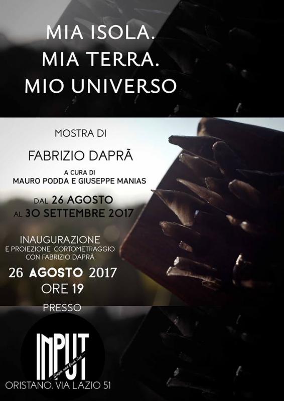 Sabato 26 Agosto 2017 alle ore 19,00 presso L'Input di Oristano in Via lazio, 51 verrà inaugurata la mostra "Mia Isola. Mia terra. Mio Universo." dell'artista Fabrizio Daprà a cura di Mauro Podda e Giuseppe Manias. La mostra organizzata dall'Input allestita da Mauro Podda in collaborazione con la Biblioteca Gramsciana e l'Input rimarrà aperta sino al 30 Settembre.