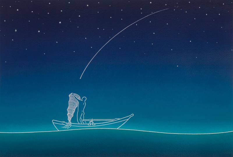 In esposizione una serie di recenti dipinti a olio e china su carta: sintetici lavori dal taglio narrativo, nei quali è raffigurato un minuscolo individuo - inconfondibile protagonista delle opere di Taddei - che conduce una paradossale esistenza, sospesa proprio tra cielo e mare.