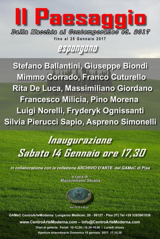 Si inaugura Sabato 14 Gennaio 2017 alle ore 17,30 (visitabile fino al 25 Gennaio 2017 con ingresso libero) a cura Massimiliano Sbrana, presso il GAMeC CentroArteModerna di Pisa (Lungarno Mediceo,26) la mostra "Dalla Macchia al Contemporaneo" dedicata in questa edizione al tema del "Il Paesaggio" .