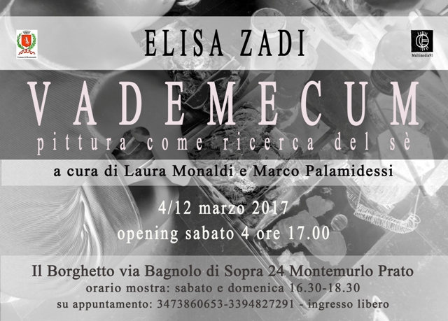 Nuovo appuntamento con l'arte al Centro espositivo “Il Borghetto” (via Bagnolo di sopra, 24 - Montemurlo) dove sabato 4 marzo alle ore 17 s'inaugura “Vademecum, la pittura come ricerca del sé”, la mostra di Elisa Zadi, curata da Cinzio Cavallarin, con la presentazione critica di Laura Monaldi e Marco Palamidessi e il patrocinio dell'assessorato alla cultura del Comune di Montemurlo.