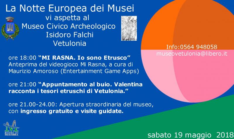 -ore 21:00 “Appuntamento al buio. Valentina racconta i tesori etruschi di Vetulonia.” Valentina Murru (Unione Italiana Ciechi Grosseto) condurrà i partecipanti in un viaggio sensoriale alla scoperta di alcuni capolavori del Museo. Il pubblico non vedente o bendato vivrà un'esperienza unica: Valentina infatti presenterà i principali temi della cultura etrusca (simposio, toilette, religione), toccando gli oggetti, originali o copie, e raccontandoli ai presenti, che saranno guidati nella loro scoperta con un approccio diverso, focalizzato sull'esperienza tattile.