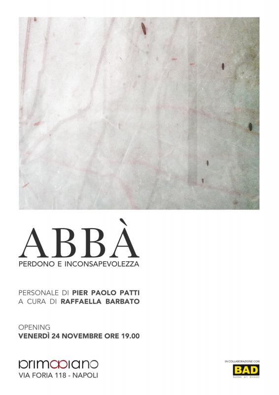 “Abbà, perdono e inconsapevolezza” è il titolo di piena ispirazione e riferimento evangelico della prima personale napoletana di Pier Paolo Patti. La mostra, visitabile fino al 15 gennaio 2018, si inaugura venerdì 24 novembre nei suggestivi spazi della home gallery PrimoPiano di Antonio Maiorino e Massimo Pastore.