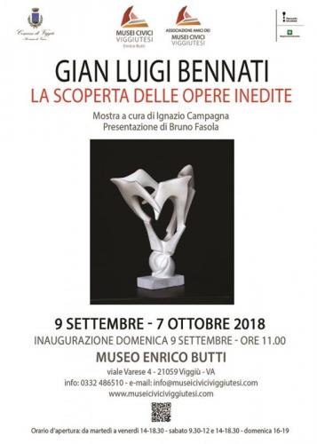 Dopo la pausa estiva riprende il nostro calendario espositivo con l'appuntamento di domenica 9 settembre 2018 alle ore 11.00 presso il Museo Butti di Viggiù, sarà inaugurata la mostra dello scultore Gian Luigi Bennati dal titolo La scoperta delle opere inedite a cura di Ignazio Campagna e presentazione dello Storico dell'Arte prof. Bruno Fasola. Una ventina di opere sconosciute saranno presenti qui a Viggiù con sculture di marmo, bronzo, ceramica e gesso patinato. Le sculture saranno esposte presso la consueta sala espositiva che fu lo studio di Enrico Butti e nella Gipsoteca. La manifestazione si concluderà domenica 7 ottobre 2018.