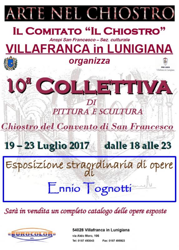 Anniversario importante per “Arte nel Chiostro” a Villafranca Lunigiana (Ms): la collettiva di pittura e scultura festeggia la sua decima edizione che si terrà nell’omonimo Chiostro del Convento di San Francesco da mercoledì 19 luglio a domenica 23, con un orario quasi notturno, dalle ore 18 alle 23.
