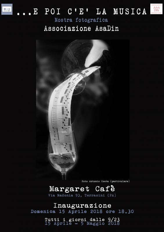 Domenica 15 Aprile 2018 alle ore 18.30, presso il Margaret Cafè di Terrasini (PA), sarà inaugurata la mostra fotografica intitolata “…e poi c’è la musica” dell’Associazione Asadin. Fotografi/e: Giovanna Biondo, Caterina Blunda, Antonio Costa, Evelin Costa, Marcello Impastato, Pino Manzella, Nicola Palazzolo, Daniela Riedlova, Massimo Russo Tramontana.