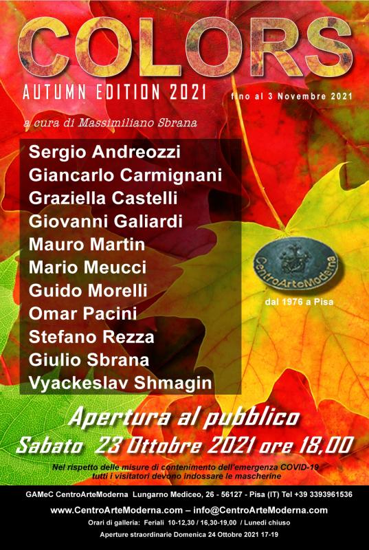 Si inaugura Sabato 23 Ottobre 2021 alle ore 18,00 presso gli spazi espositivi della Galleria d'Arte Moderna e Contemporanea CentroArteModerna di Pisa, a cura di Massimiliano Sbrana, sul Lungarno Mediceo al n.26, la mostra collettiva "Colors: Autumn Edition" .
