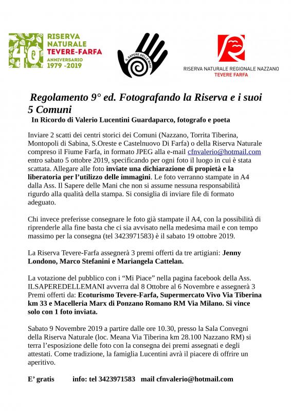 L’ associazione “Il Sapere delle Mani”, il “Comitato Amici di Valerio” con il patrocinio della Riserva Naturale Regionale di Nazzano Tevere-Farfa presentano la nona edizione di Fotografando la Riserva.