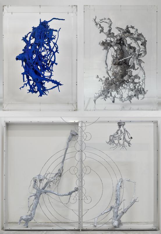 Nel 2005 l’artista ci offre attraverso la contrapposizione di due radici d’albero l’una discendente e l’altra ascendente, una nuova rappresentazione simbolica dell’alto/basso, i due elementi nell’intersezione formano una croce di cui essi costituiscono l’asse verticale e la linea orizzontale sulla quale si incontrano, il centro, unisce i gradi dell’esistenza che nell’orizzontalità trovano il proprio sviluppo, quello del linguaggio umano trasceso nella verticalità.