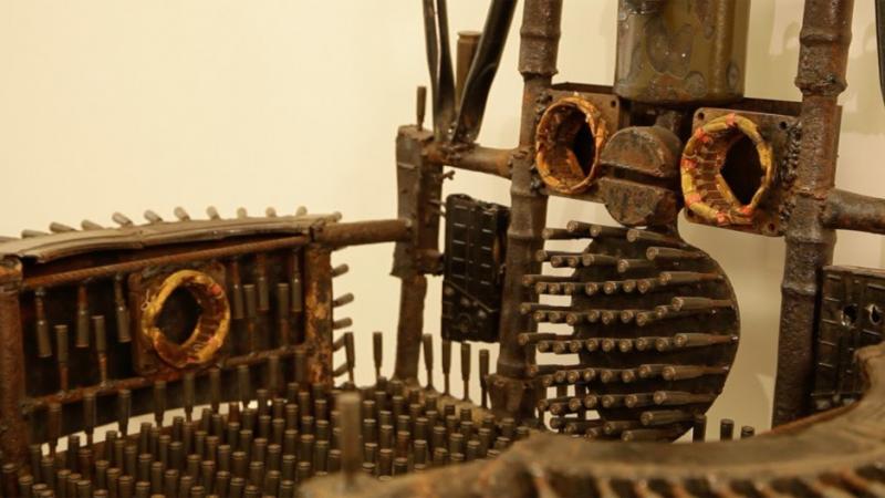 Gonçalo Mabunda realizza maschere, sculture e troni con oggetti inusuali come i Kalashnikov, bombe, pistole e altre armi utilizzate durante la guerra civile del Mozambico (1976-1992), successivamente disattivate da una Ong e dall’artista trasformate in opere d’arte.