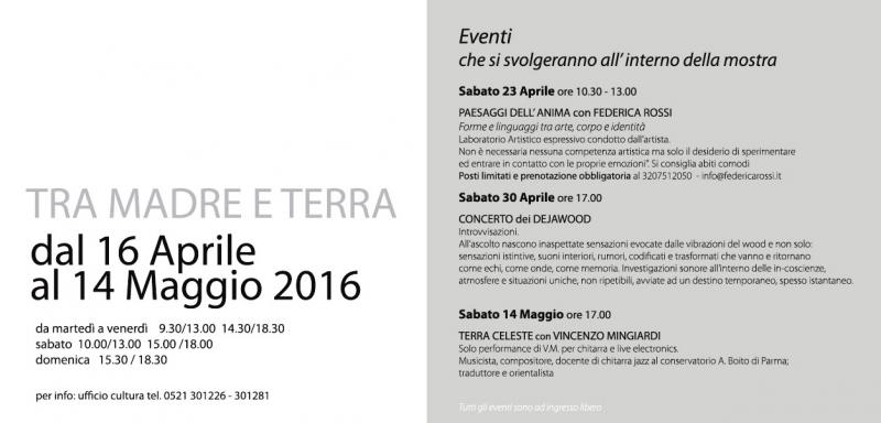 L’Amministrazione Comunale di Collecchio ospita ed organizza l’esposizione dell’artista collecchiese, intitolata ‘Tra madre e terra’, nel decennale della sua carriera: le opere, circa trenta, e il materiale d’archivio selezionati documentano l’attività di Federica Rossi a sostegno della promozione dell’arte contemporanea italiana e straniera.