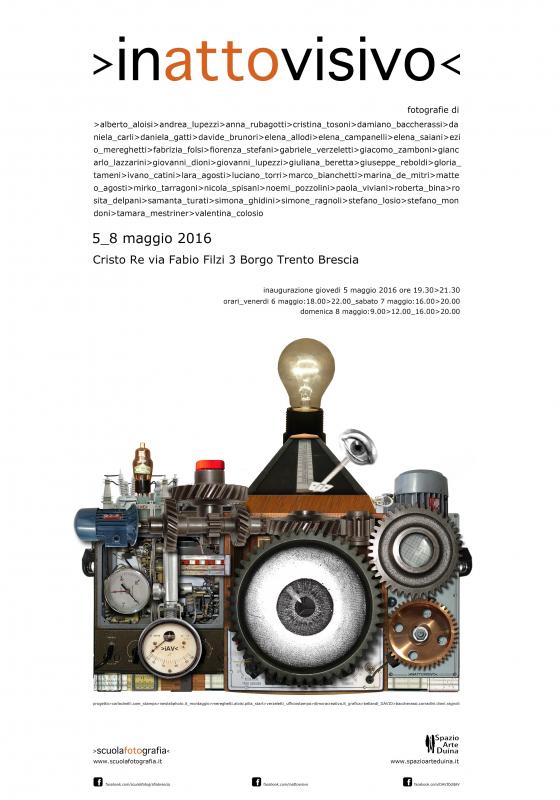 L'inaugurazione della mostra >inATTOvisivo< è per giovedì 5 maggio 2016 alle ore 19.30, presso la Sala Cristo Re di via Fabio Filzi, 3 (Borgo Trento) Brescia, ed è aperta a tutti. La mostra rimarrà aperta al pubblico venerdì 6 maggio dalle ore 18 alle ore 22, sabato 7 maggio dalle ore 16 alle ore 20 e domenica 8 maggio dalle ore 9 alle 12 e dalle 16 alle 20. Si ringrazia per il contributo alla realizzazione Parrocchia Cristo Re di Brescia www.parrocchiacristorebrescia.it
