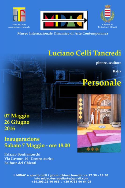 La stagione artistica 2016 del Museo MIDAC a Belforte del Chienti, continua con il secondo evento dell'anno: "Personale" di Luciano Celli Tancredi(Italia). La mostra, curata da Terra dell'Arte e con il patrocinio dell'Amministrazione Comunale, si terrà a Palazzo Bonfranceschi, in Via Cavour, 14, centro storico di Belforte del Chienti, dal 7 Maggio al 26 Giugno 2016.