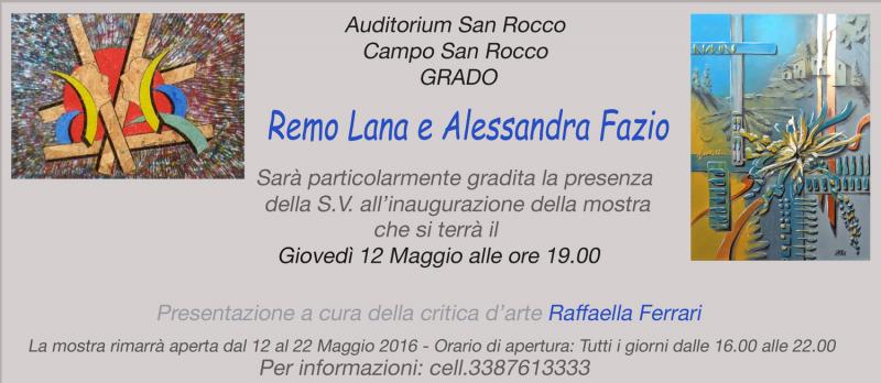 A Grado giovedì 12 maggio 2016 alle ore 19.00 presso l’Auditorium di San Rocco in Campo San Rocco sarà inaugurata la mostra bipersonale degli artisti Remo Lana e Alessandra Fazio, intervento critico di Raffaella Ferrari.