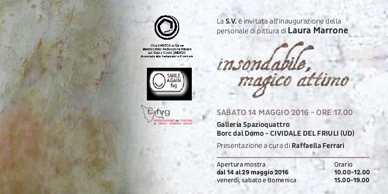 A Cividale del Friuli (UD) sabato 14 maggio alle ore 17.00 nella Galleria d'Arte Galleria Spazioquattro in Borc dal Domo l'artista Laura Marrone inaugurerà la propria mostra personale: "Insondabile magico attimo", intervento critico di Raffaella Ferrari. Con il patrocinio del Club Unesco, SmileAgain FVG e Tin FVG Associazione Toscani in FVG.