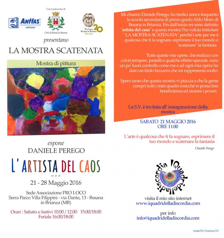 “Mi chiamo Daniele Perego, ho tredici anni e frequento la scuola secondaria di primo grado Aldo Moro di Besana in Brianza. Fin dall’inizio mi sono definito “Artista del Caos” e questa mostra l’ho voluta intitolare “La Mostra Scatenata” perché l’arte per me è qualcosa che ti fa sognare, esprimere il tuo mondo e scatenare la fantasia.