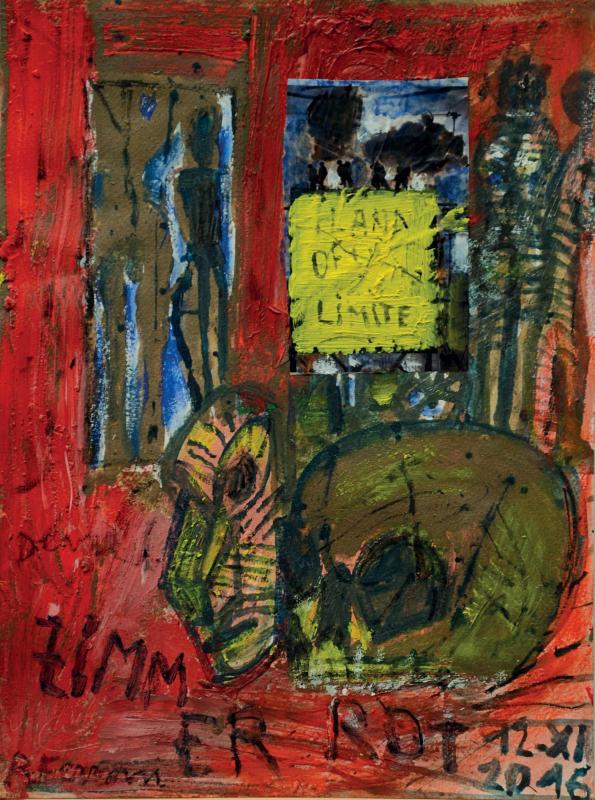 Partendo da una presa di coscienza della condizione umana, Renzo Ferrari si lascia attraversare dalla realtà storica, “si fa impregnare dei suoi umori e la rielabora nelle sue pitture di immagini” in cui si coagulano suggestioni televisive, letterarie ad autobiografiche. In questi “appunti visivi” l’artista elimina lo “scenario”, cioè la densità dello “spazio-ambiente” (e “spazio-tempo”), per soffermarsi su (s)oggetti scarni e scarnificati, su presenze inquiete, a cui tuttavia non manca una sottile ironia. Ne sono un esempio i suoi teschi che, simili a delle macabre maschere africane, evocano una memoria ancestrale contaminata dal quotidiano e dalla squillante materia cromatica.