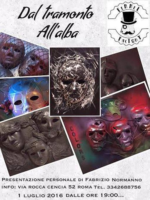 Il ciclo della vita attraverso delle maschere. Fabrizio Normanni, un giovane artista romano, con questa mostra propone a tutti gli osservatori un viaggio alla scoperta dell’inconscio alla ricerca di un equilibrio e di sensazioni primordiali. Come affermava Nietzsche “..tutto ciò che è profondo, ama la maschera. Ogni spirito profondo ha bisogno di una maschera e più ancora, intorno a lui cresce una maschera, grazie alla superficiale interpretazione di ogni parola, o passo, di ogni segno della vita che egli dà”. Maschere inespressive si animano magicamente dando vita a un turbinio di sensazioni spesso represse. Le maschere costituiscono una proiezione del mondo interiore di Fabrizio, delle sue angosce e delle sue visioni. Ed è proprio questo ciò l’artista vuole far percorrere a ciascuno di noi. Un viaggio attraverso le pieghe del nostro inconscio, in quell’inconscio che muove e regola l’esistenza alla ricerca della luce, dell’equilibrio e della felicità. Fabrizio ha iniziato a dipingere in un momento particolare della sua vita e, attraverso le sue creazioni è riuscito a emergere dal buio che lo avvolgeva, è riuscito a esprimere le emozioni che reprimeva fino ad arrivare alla realtà, al quotidiano. Le maschere, i colori e gli abbinamenti delle opere non sono scelti casualmente ma sono frutto di uno studio accurato. Fabrizio Normanni nasce a Roma il 3 luglio e inizia a dipingere a soli 17 anni. Da allora non ha mai smesso. Le maschere scelte per realizzare i suoi quadri sono prive d'espressione, inanimate. Sono delle tele vergini su cui imprimere sensazioni, paure e tormenti che animano la notte, perché è proprio la notte il momento in cui si viene travolti dalle emozioni. Da qui il titolo "dal tramonto all'alba" un lasso di tempo che potrebbe rappresentare il ciclo della vita toccando temi come le 4 stagioni, passando dalla famiglia per arrivare a sbriciare sul futuro senza trascurare il delicato tema della morte e della malattia.