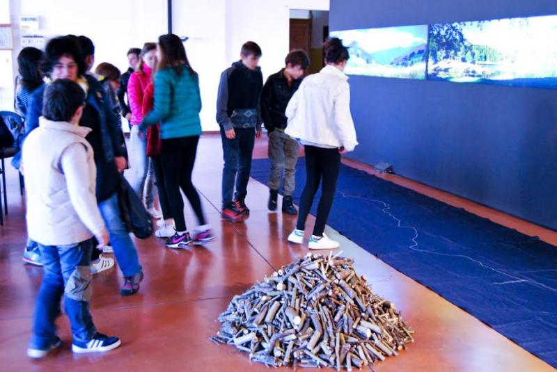 La Toselli ha deciso di concretizzare questa riflessione attraverso i medium che la caratterizzano: l’uso della seta, che ha implicito in sé il senso del sacrificio (la morte del baco per la realizzazione di questa preziosa fibra), e del ricamo. Una lunga striscia di seta blu, come il cielo e come il mare che si specchiano, che diventano una cosa sola con la terra, su cui ha ricamato in scala 1:10.000 la linea della cresta appenninica vista dall’alto, simbolo dell’unione dei due continenti. Le numerose e continue morti, che coinvolgono i migranti nel Mediterraneo e non solo, aprono a una riflessione sulla separazione e l’avvicinamento di due terre solo apparentemente lontane. L’artista invita ad una azione condivisa che andrà crescendo nel corso dei mesi, coinvolgendo abitanti del luogo e turisti, attraverso l’accumulo di legnetti di 10 cm cad., che rappresentano in scala 1:10 l’unità di misura del metro lineare. Vorrebbe chiedere a ogni visitatore di portare uno o più legnetti per partecipare all’installazione e riuscire, con il tempo, a raggiungere il numero delle vittime delle migrazioni fino ad ora documentate in 27.382 (cifra aggiornata al 2 febbraio 2016 e purtroppo ancora in crescita).