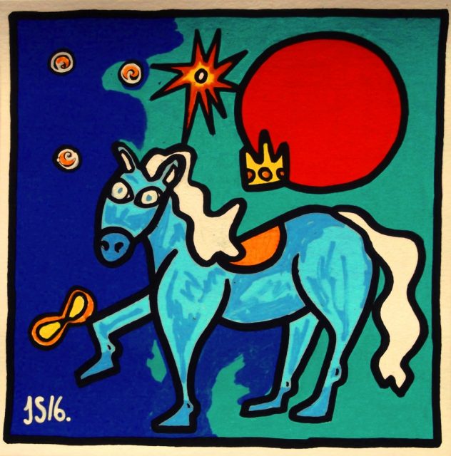 I suoi personaggi stilizzati, i simboli arcani, il bianco e nero o l’uso di colori primari, personaggi usciti da favole e da incubi, … impossibile non troviate l’opera che fa per voi.