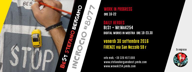 In concomitanza con l’installazione BEVOVINO (via S.Niccolò 59r) ospiterà le opere digitali di BeSt e WeWaK254 della serie DAILY HEROES, dove i protagonisti non sono i supereroi positivi, forti, buoni e soprattutto belli bensì gli eroi quotidiani che superano ogni giorno le difficoltà che la vita riserva ad ognuno. Si confondono nella folla, a volte sono goffi o fragili, ma lottano quotidianamente con coraggio contro le piccole e grandi avversità. Sono gli ‘antieroi’, che sono ovunque, che non sono invincibili ma che non si arrendono mai.