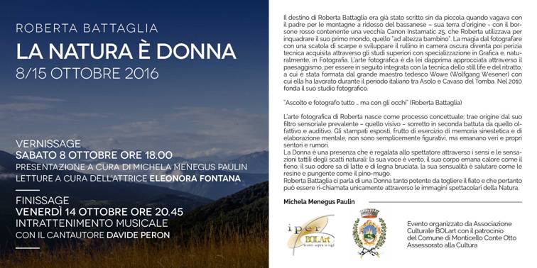- il finissage dei venerdì 14 ottobre alle ore 20.45, in cui il cantautore Davide Peron evocherà musicalmente le immagini di Roberta Battaglia.