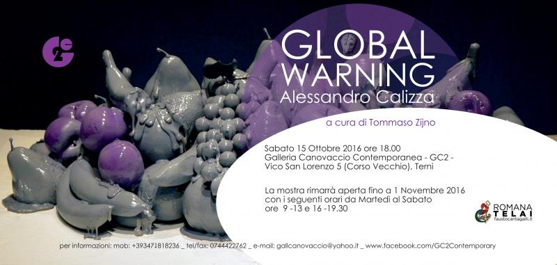 A Terni Calizza torna dopo essere stato protagonista di uno dei Venerdì Incredibili, organizzati dal F.A.T - CAOS e PLAY, esposizione collettiva tenutasi sempre presso la galleria il Canovaccio, assieme a Cristiano Carotti, Desiderio, Marco Piantoni, Sergio Silvi e Volodymyr Kuznetsov. Questa personale vuole porre l'attenzione sulla sua produzione più recente, idealmente divisibile in 3 filoni principali: GLOBAL WARNING, che dà il nome alla mostra, in cui si inseriscono tele e sculture dalle cromie forti e inconfondibili, raffiguranti teste e busti di statue classiche nell'atto di liquefarsi o vittime di incuria e segnate dal tempo. Il messaggio di disfacimento dei valori, ritenuti ideali dall'artista, e una profonda riflessione critica sulla nostra contemporaneità permea tutta la produzione di Alessandro Calizza e nella seconda serie, intitolata STEAL LIFE, viene veicolato da grandi nature morte che fungono da allegorie della condizione sociale che viviamo, logorata e sempre più vicina al collasso. A collegare queste due prime riflessioni si inseriscono sculture e assemblaggi raffiguranti alcuni degli elementi tipici della vanitas, simbolo di decadenza e di ammonimento sull'effimera condizione dell'esistenza. L'ultima sezione, OH SHEET!, raccoglie incisioni d'epoca, sulle quali l'artista interviene dipingendo piante carnivore, ruderi allagati o riconquistati dalla natura, strani inquietanti vermoni, tutto sotto l'occhio inerme dell'uomo che, se non sarà capace di reagire a tutto ciò, avrà ben poche possibilità di riscatto.